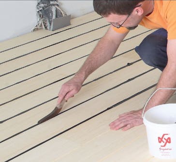 På siden af bjælkerne skrues brædder (lasker) fast. De bruges til at rette underlaget op. Oven på laskerne skal du bygge et undergulv, der skal bære varmefordelings pladerne og det svømmende gulv. Her bruger vi forskallingsbrædder til undergulvet. De er uden fer og not, så det er vigtigt, at de lægges med et par millimeters mellemrum, så de ikke gnider mod hinanden. Ellers risikerer du, at det færdige gulv knirker.