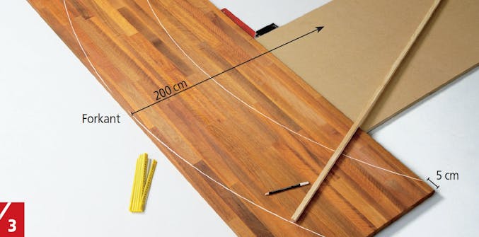 Barpladens bueform laves ved hjælp af en slags hjemmelavet “passer”. Du lægger barpladen med en vinkelret plade ud fra midten. Så tager du en liste på 220 cm, som du gør fast med et søm 200 cm fra forkanten. Tegn så den forreste bue der udgør forkanten. Den anden bue tegnes på samme måde. Her skal der være en afstand på fem cm til hjørnet.
