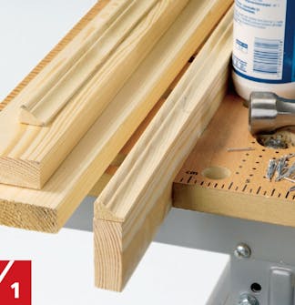 Profillisterne (C) sømmes på kanten af bærelisterne (B), til det bruger du 12 x 25 mm dykkere. Søm og lim så hylden (A) på bærelisterne med 18 x 40 mm dykkere. Når det er gjort, saver du hylderne til med et snit på 45 grader i alle ender.