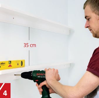 Mål ud, hvor du vil placere hylderne, og mærk af ved hjælp af en lige liste og vaterpas. De to brede hylder placeres i samme højde som barens bordplade. De smalle er her anbragt 45 cm over de brede.
