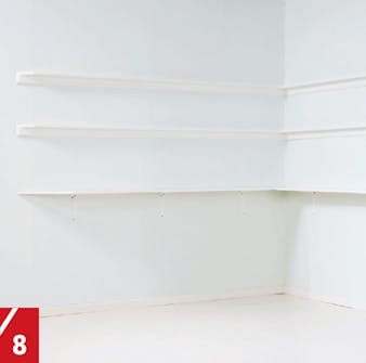 De brede hylder sættes op med hyldeknægte, der skrues fas i væggen. Ved at bruge tre hyldeknægte til hver hylde sikrer du, at de kan holde til en del vægt.