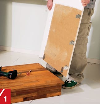 Bordpladen skubber du på plads oven på de to skabe og fastgør den med 4 x 40 mm skruer gennem listerne i toppen af skabene.