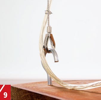 De bageste kroge til ophængningen skrues fast et par cm inde på pladen. De to forreste placerer du cirka 30 cm fra enderne for at skabe balance. Stram stålwirerne om kovserne, og fastgør dem med wirelåse.