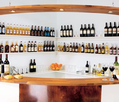 Selve baren er selvfølgelig det absolutte midtpunkt, men har du baren alene, er det meget begrænset, hvor meget plads du har til opbevaring af glas og flasker. Derfor er det en god idé at placere baren i et hjørne og så sætte hylder op på væggen. For at gøre arbejdet med hylderne nemmere for dig selv bør du sætte dem op, inden baren placeres, så baren ikke kommer til at stå i vejen, når de skal op at hænge. Her sættes der både smalle og brede hylder op. De smal-le er gode til opbevaringen af glas og fla-sker, mens de brede kan bruges til de lidt større ting, fx en frugtskål.