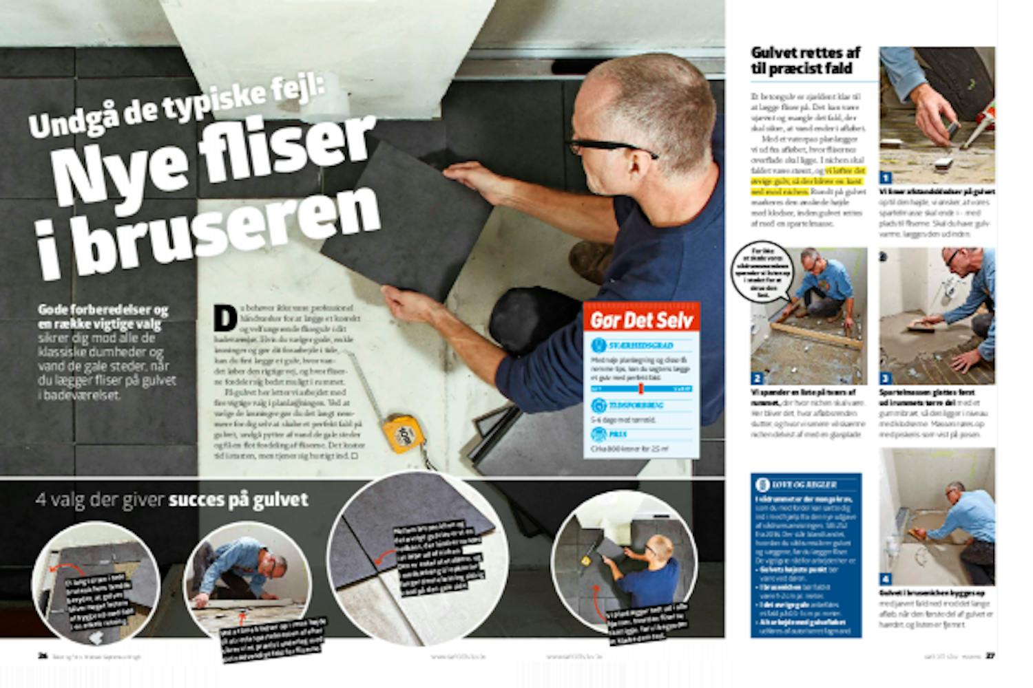 Med et vaterpas planlægger vi ud fra afløbet, hvor flisernes overflade skal ligge. I nichen skal faldet være størst, og vi løfter det øvrige gulv, så der bliver en kant ned mod nichen. Rundt på gulvet markeres den ønskede højde med klodser, inden gulvet rettes af med en spartelmasse.
