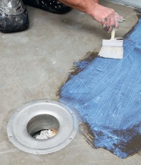 Vi primer hele gulvet. Da det er et støbt gulv, kan vi i princippet lade være at give det membran, men ud mod vægge og op til afløb og rør skal vi sikre med membran og net, og vi vælger at give det hele membran.