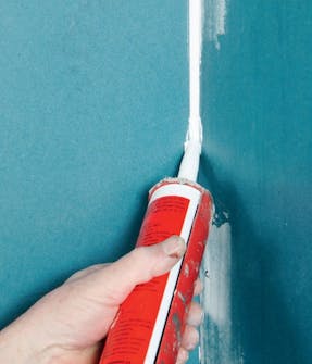 Med et stålbræt trækker vi klæber på væggen i en knap 50 cm høj bane. Vi har rørt klæberen op efter dens anvisning. Tapen gør, at vi kan starte nede på brættet uden at bekymre os om at svine det til.