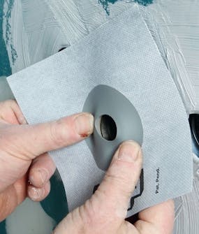 Tætningsarket klæbes fast. Centrer arket over hullet, og træk først den ene del af beskyttelsesfolien af, dernæst den anden. Pas på, for arket klæber ekstremt godt. Træd arket godt fast.