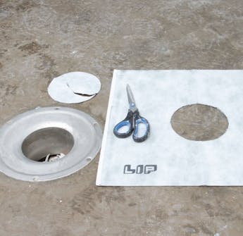 På gulvet skal vi nu sikre ind mod afløbet. Her bruger vi et helt klæbende tætningsark på 40 x 40 cm. I midten klipper vi et rundt hul, der er en lille smule større end hullet i afløbets flange.