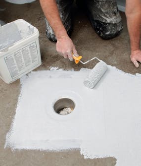 Stryg rigeligt med membran på over arket. Vær ekstra omhyggelig med at tætne langs kanten ved betonen. Her stryger du så meget membran på, at kanterne jævnes ud.