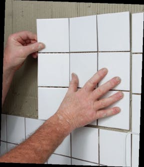 Træk en tandspartel gennem klæberen. Når den holdes i en fast vinkel med tænderne på væggen, sikrer den et jævnt lag. Tjek tykkelsen med en flise: Tryk den ind, løft den af, så skal 80 procent have klæbet.