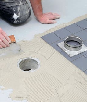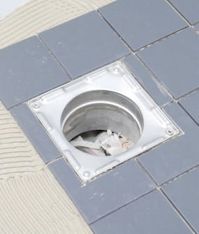 Gulvafløbets ramme klæbes fast samtidig med fliserne. Påfør et rigeligt lag klæber, og tryk rammen ned i niveau med fliserne.