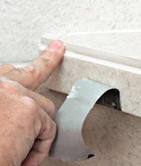 Træk fliseklæb på forkanten af den øverste hylde, og sæt flisestrimlen på. Det er en god idé at fiksere forkanten med et par stykker gaffatape, indtil limen er hærdet.