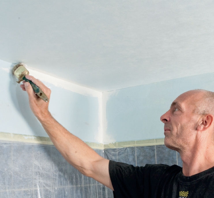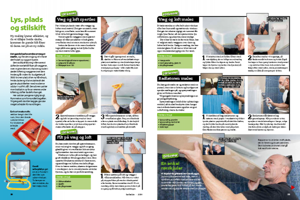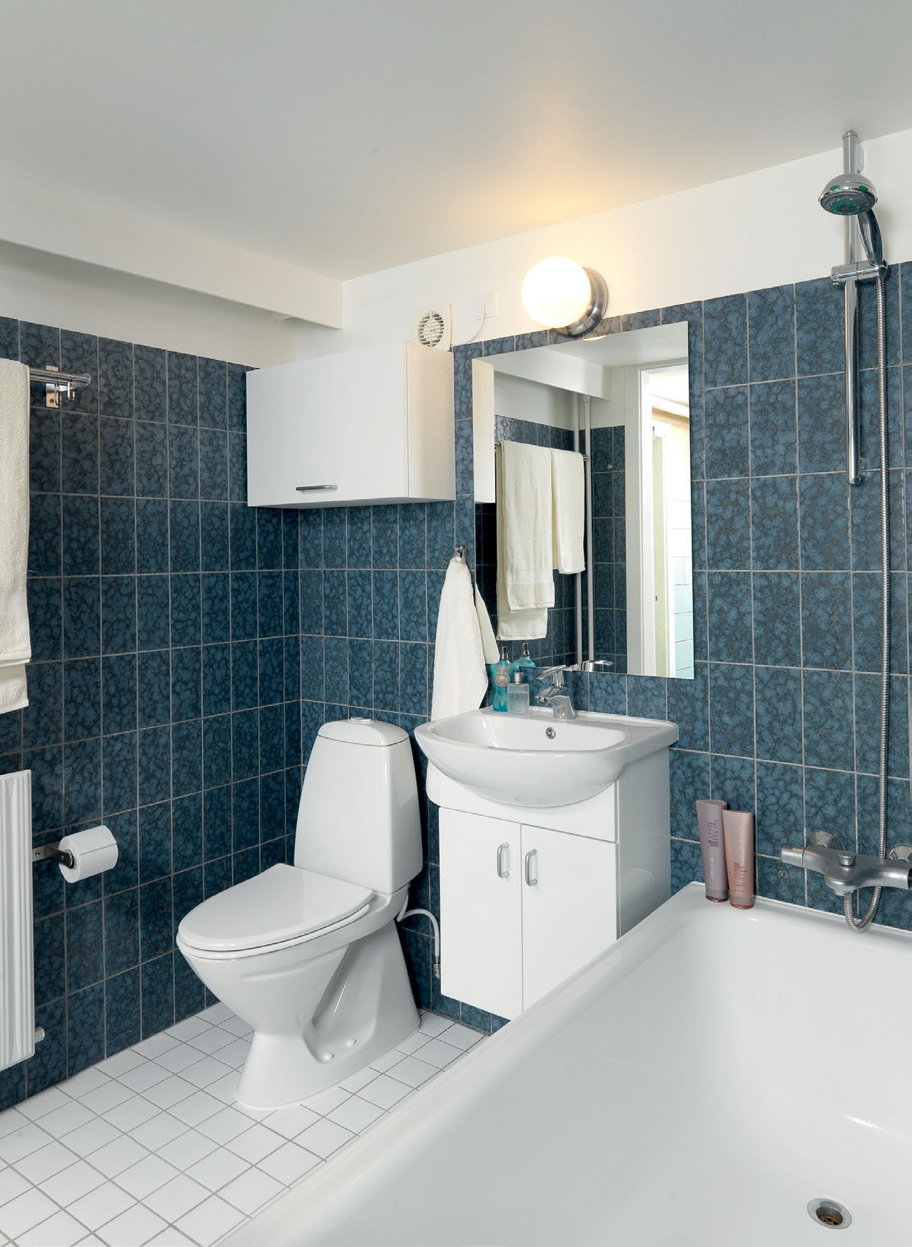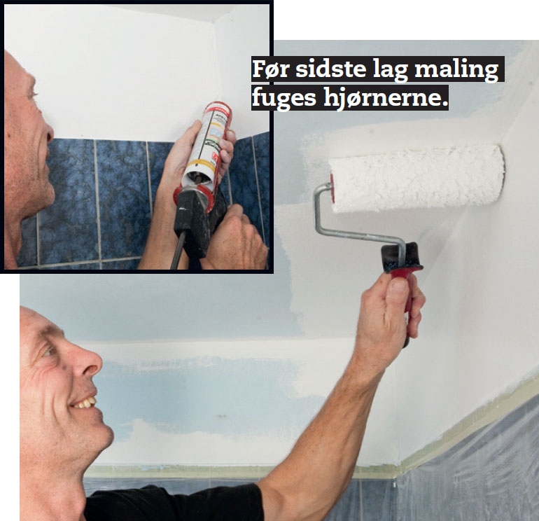 Da vi har bevaret de farvede fliser, har vi valgt at male væggene over dem og loftet helt hvide. Vælg en maling, der har mindst glans 10, så den er til at tørre af og er modstandsdygtig over for vand.