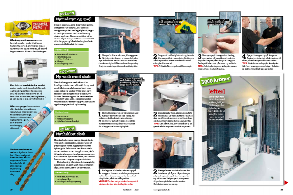 Den frithængende vask båret af to kraftige vinkler oser af fortid. En ny vask med tilhørende skab under kan i vore dage købes for under 500 kroner, og vi fandt et blandingsbatteri til knap 300 kroner. Sammen giver de badeværelset et helt nyt udseende, og skabet under vasken skjuler afløbet og giver lidt ekstra og tiltrængt plads til opbevaring.