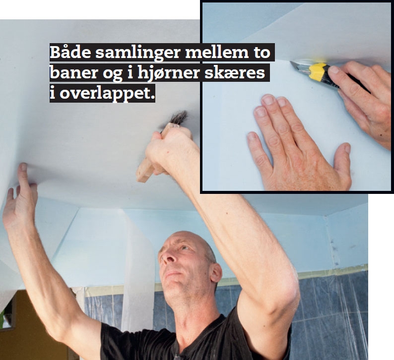 Klæberen rulles på underlaget, og den groft tilskårne filt stryges fast i den. Den opsatte filt skæres straks til i hjørnerne, og samlingerne lukkes med akrylfuge. Hvor to baner mødes, skæres de igennem i overlappet, de to overskydende strimler fjernes, og du har en perfekt samling.