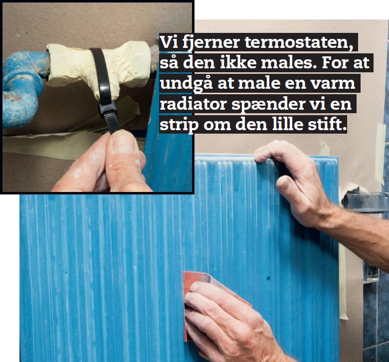Vi dækker af bag radiatoren og rørene med papir. I modsætning til den tynde plast er papiret stift, så det ikke blafrer, og det holder bedre på overskydende maling, så den ikke løber ned på gulvet. Overfladerne slibes jævne og matte.
