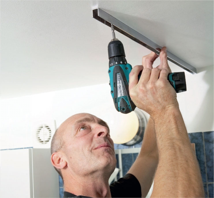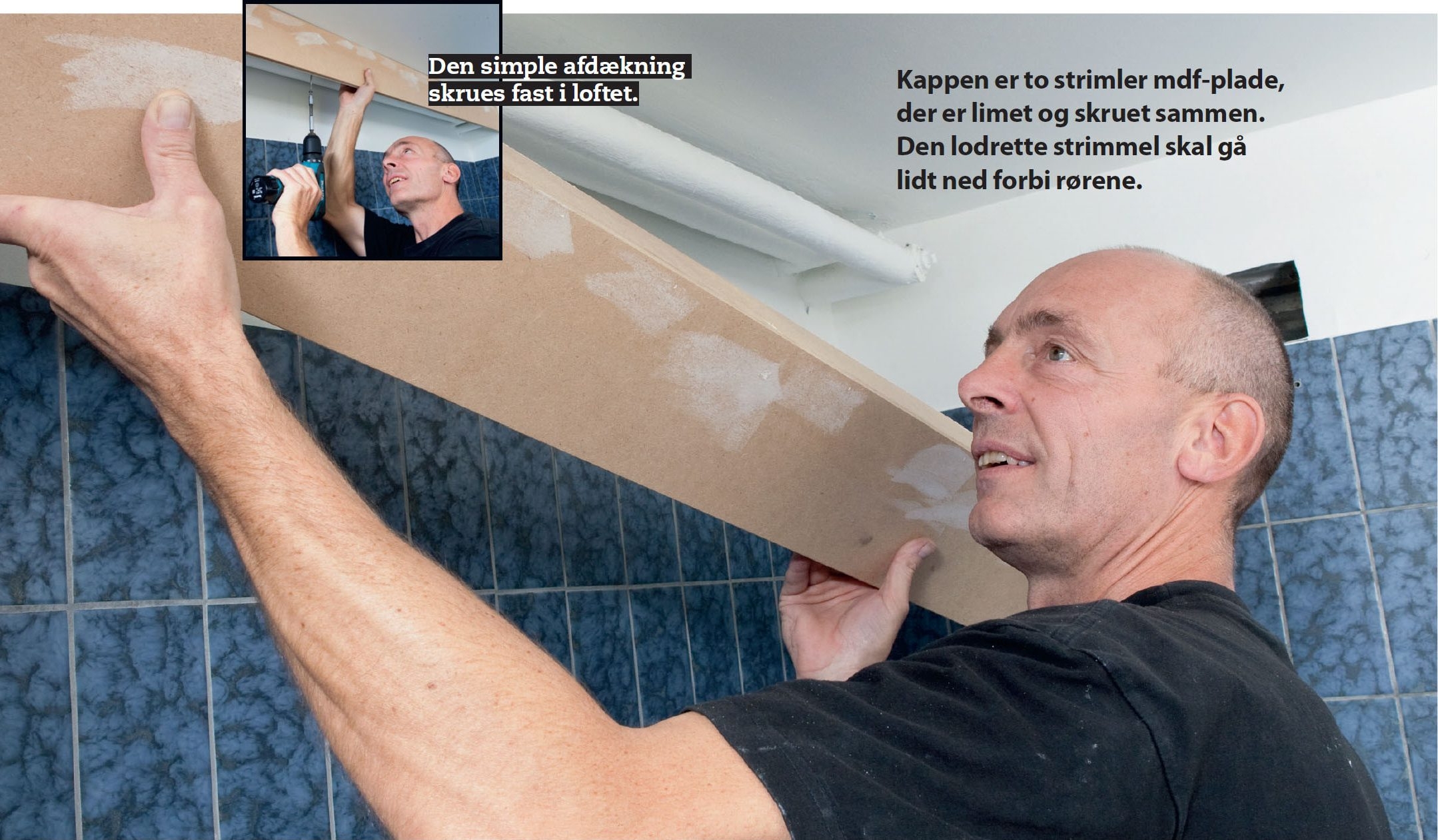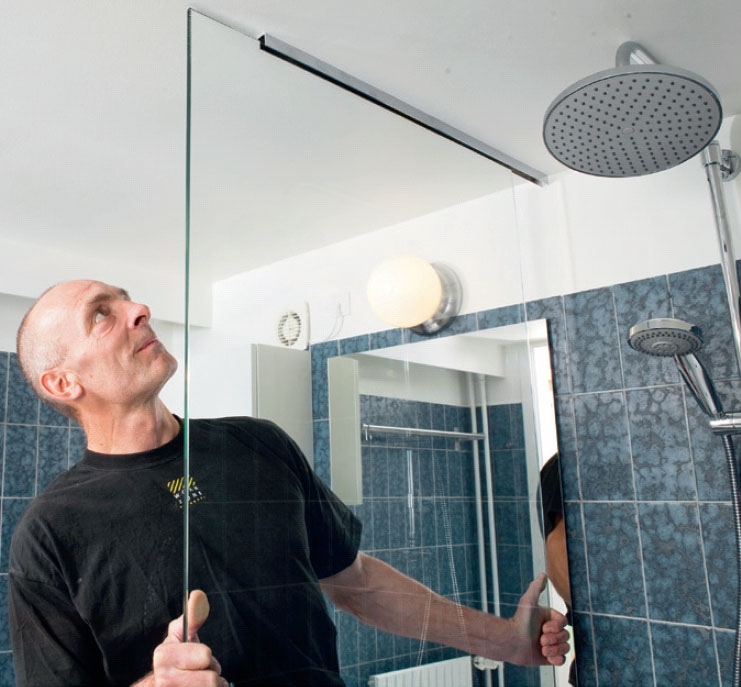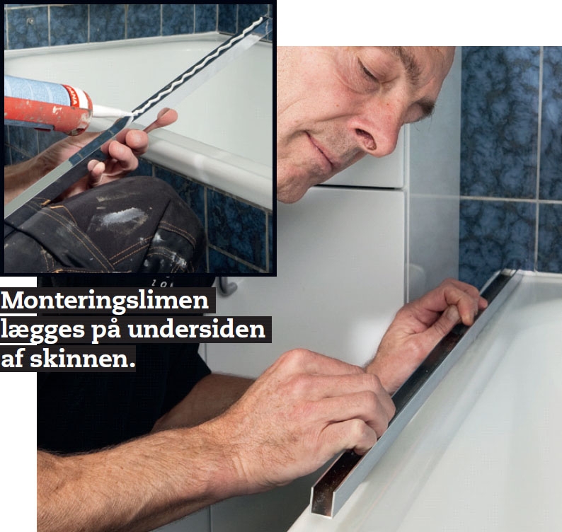 Pladen holdes af særlige skinner, som vi forneden klæber på badekarret og foroven skruer fast i loftet. For at få plads til skinnerne bestilles pladen 15 mm lavere, end der er mellem badekarret og loftet.