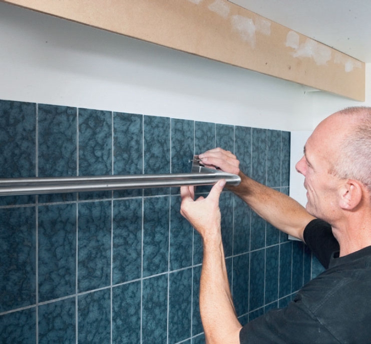 De nye holdere skrues på væggene. Så vidt muligt bruger vi de gamle huller. Nye huller bores med et murbor med skær, der skærer sig ind i flisen uden at bruge slag. Et stykke malertape hindrer boret i at glide.