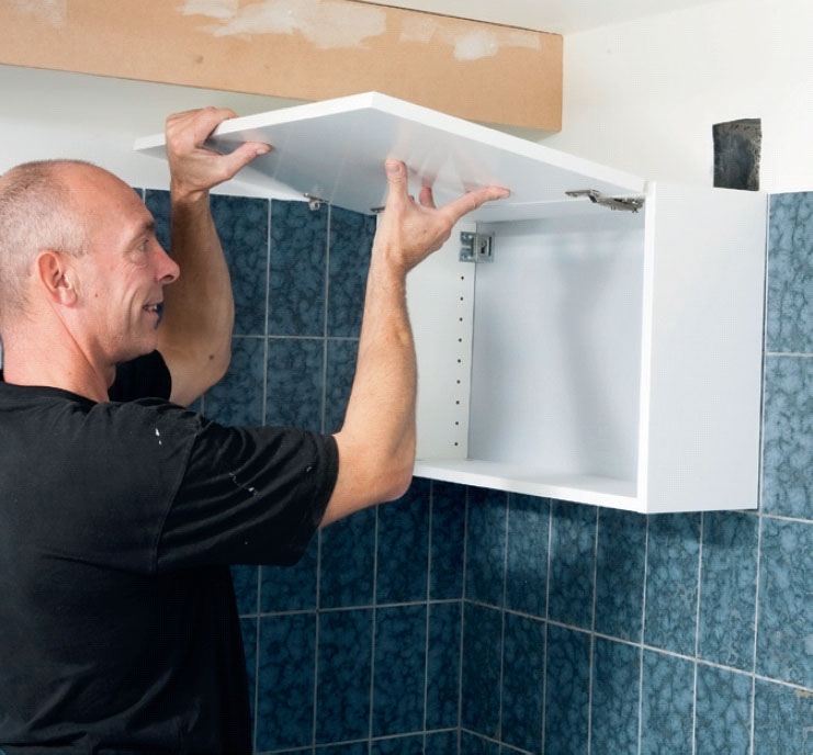 Beslagene til skabet skrues op på væggen. Uanset om du bruger de gamle huller eller må bore nye, sætter du en frisk plug i hullet, så skruen får godt fat.
