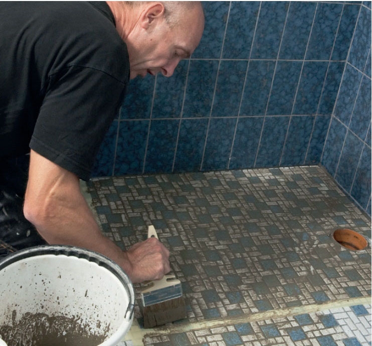 De gamle fliser renses grundigt for kalk og sæberester. Er fliserne glaserede, er det en god idé at slibe overfladen mat, fx med en excentersliber og groft slibepapir.