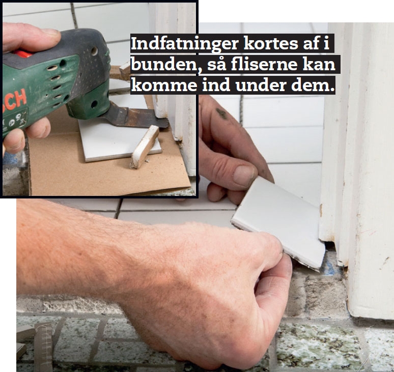 Langs vægge, rundt om rør, og som her ved dørkarmen, skærer vi fliserne til med fliseskærer eller vinkelsliber.