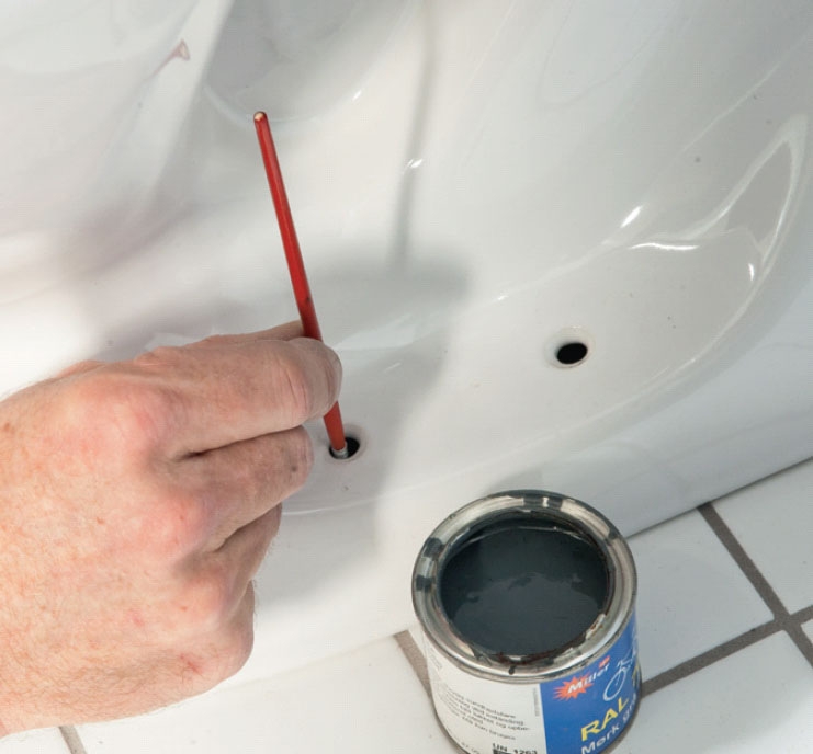 Toilettet stilles på sin nye plads, og skruehullerne markeres. En almindelig blyant eller tusch kan ikke nå ned i hullerne, i stedet markerer vi, hvor skruerne skal sidde, med en dråbe maling på en tynd pensel. Hold penslen helt lodret, og dup den ned.