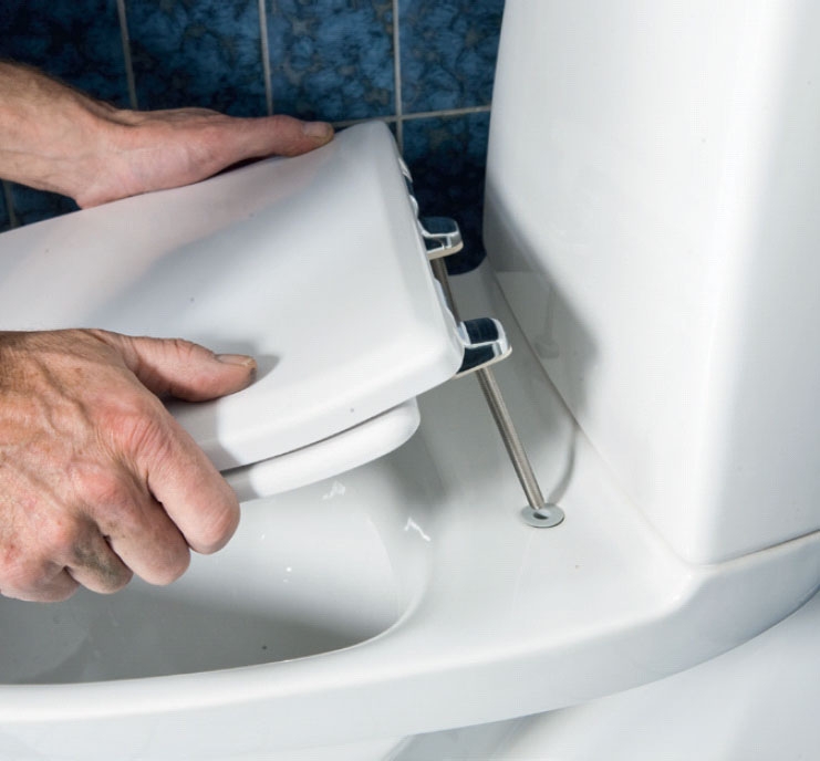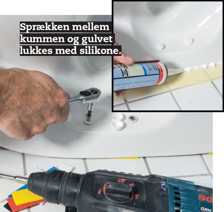 Toilettet fjernes, og de fire huller bores. Murboret skal passe til de plugs, skruerne skal sidde i, og kunne bore gennem fliserne uden slag. Toilettet sættes på plads og rettes op med små plastklodser. Skruerne spændes i med en skruetrækker eller skralde.
