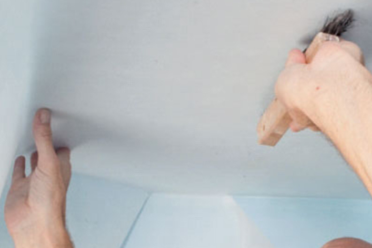 Vi starter med at lukke flten med vævfylder, der er billigere end maling og fylder filten hurtigere og bedre. Først tager du hjørner og kanter med pensel, så følger du op med rullen.