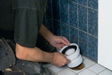 Vi skifter til en ny manchet i afløbet, selv om den gamle virkede god nok. Det er besværligt at komme til afløbet, når det nye toilet er på plads, og en frisk gummipakning sikrer, at samlingen bliver tæt og holder de kedelige lugte fra kloakken ude.