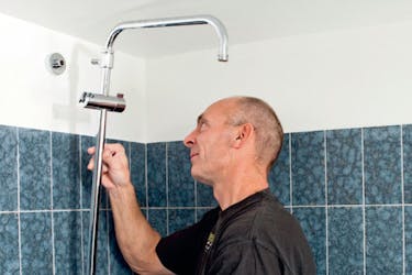 Målet fra blandingsbatteriet til loftet skal med på indkøb, så du kan vælge et brusesystem, du kan stå under, og som der er plads til under loftet.