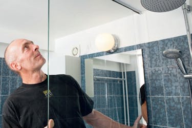 Målet til glaspladen tages i god tid, der er lang leveringstid. Højden skal være 15 mm mindre end afstanden fra badekarret til loftet, så der er plads til skinnerne. Vi bestiller glaspladen i knap halvdelen af karrets længde, så den skærmer godt af.