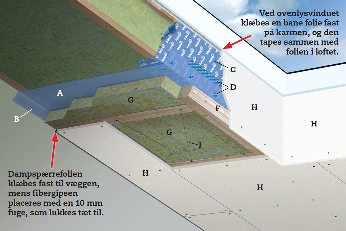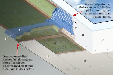Dampspærren er en 0,2 mm tyk profoilplast, som du skal sætte op så plant og stramt som muligt og med så få sa mlinger som muligt.