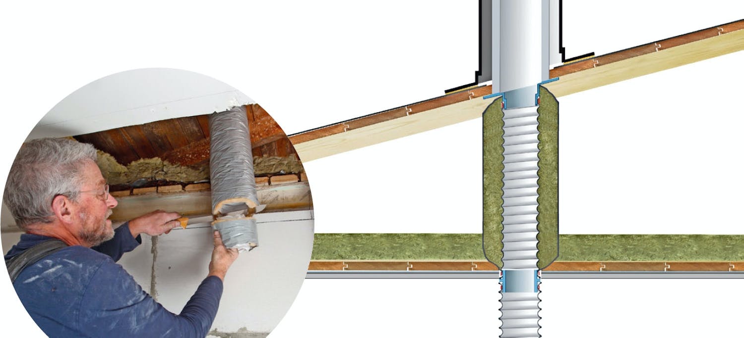 Vi fører ventilationsrør op under det nedhængte loft og sætter en god ventilator op. Den har fugtstyring, så den selv starter, når der er behov for det.