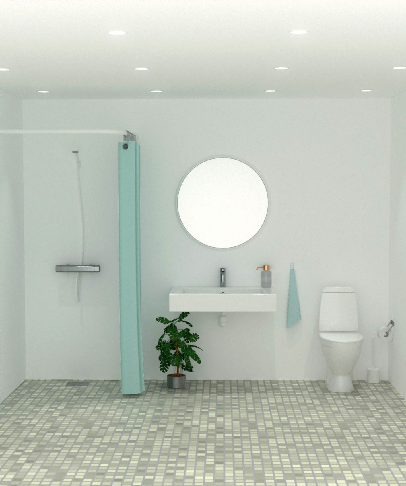 Når væggene er pudset, kan du enten lade pudsen stå, som den er, grå og rustik, eller male den over. I vådzonen er det klogt at male mange gange med en god, solid vådrumsmaling. Det skal nok holde sig pænt i nogle år.