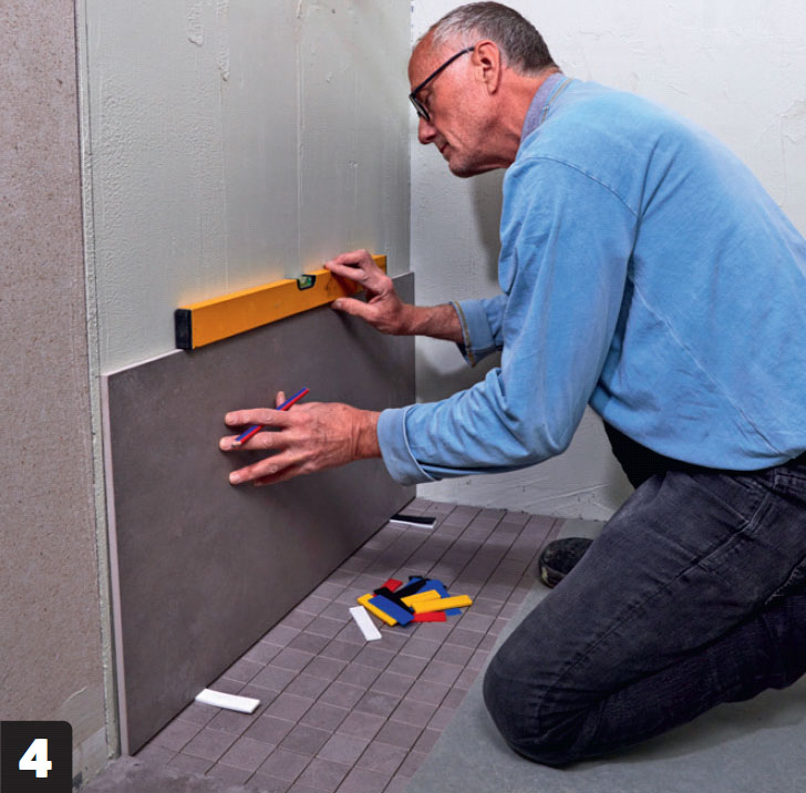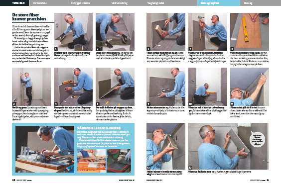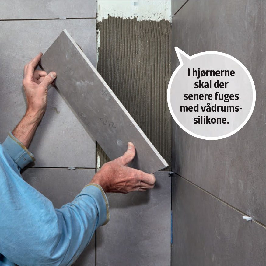 Sætter du mindre fliser på væggene, starter du med anden række fra gulvet, støttet på en liste, og så retter du den nederste række fliser til i forhold til gulvet, inden den klæbes op. Den manøvre er vanskelig med de store fliser.