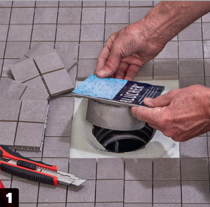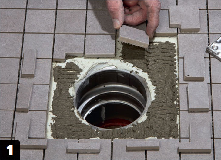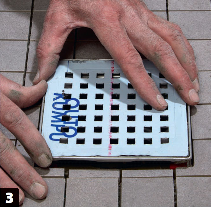 De tilskårne mosaikker limes på plads omkring afløbsristen én efter én. Sørg for, at de ligger plant, og at fugerne flugter.