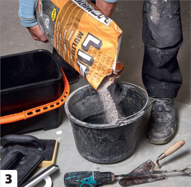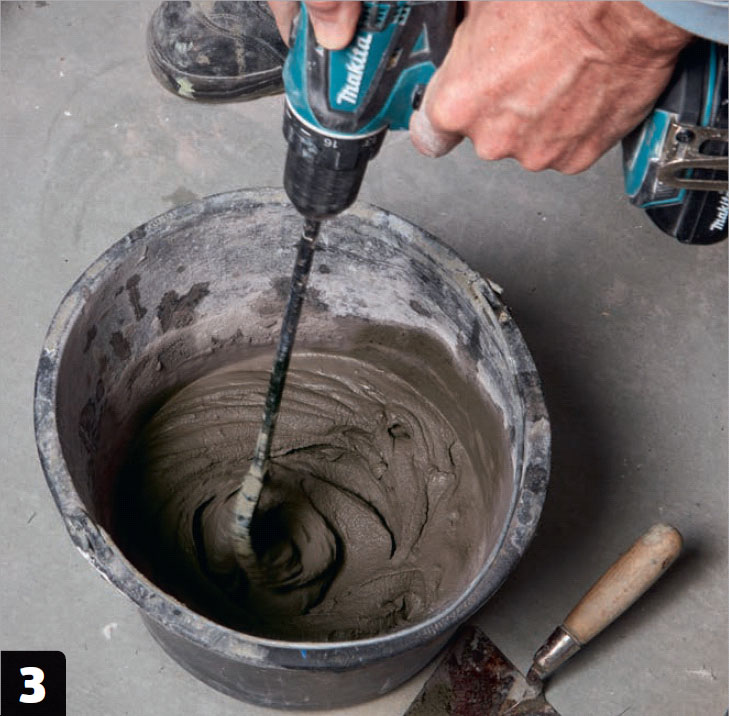 Nu skal der fuges mellem fliserne. Fugen blandes op. Vi har valgt en grå fuge. Husk, at farvede fuger som hvid og sort altid er mere sårbare end grå.