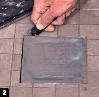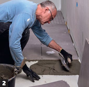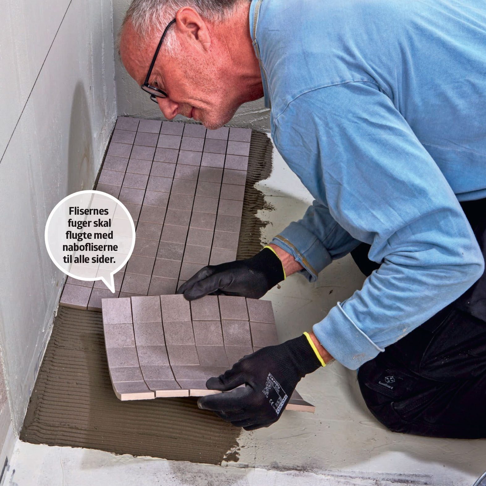 Smør på ét felt ad gangen, og læg så klæber på det næste stykke. Flisekryds hjælper med at holde den perfekte fugeafstand.