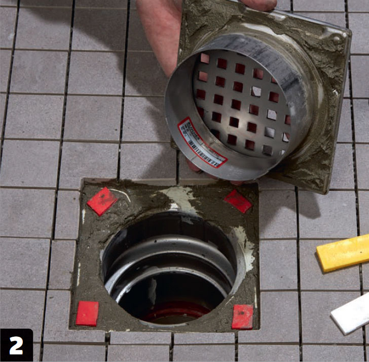 Sæt afløbsristen i, når fliserne er lagt løst op omkring afløbet. Selve risten kan roteres 360° og kippes ca. 10° i forhold til underdelen, så du altid kan få risten til at ligge plant og i niveau med fliserne.