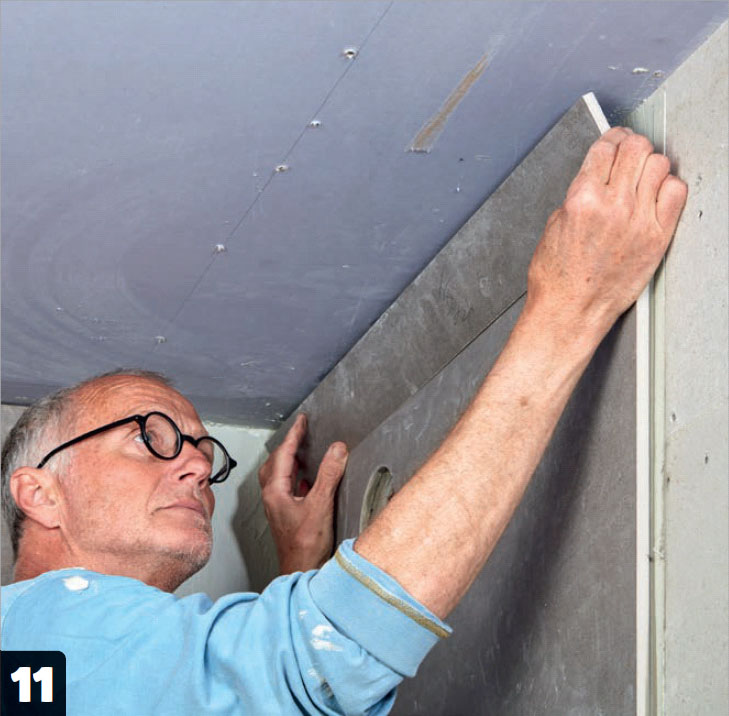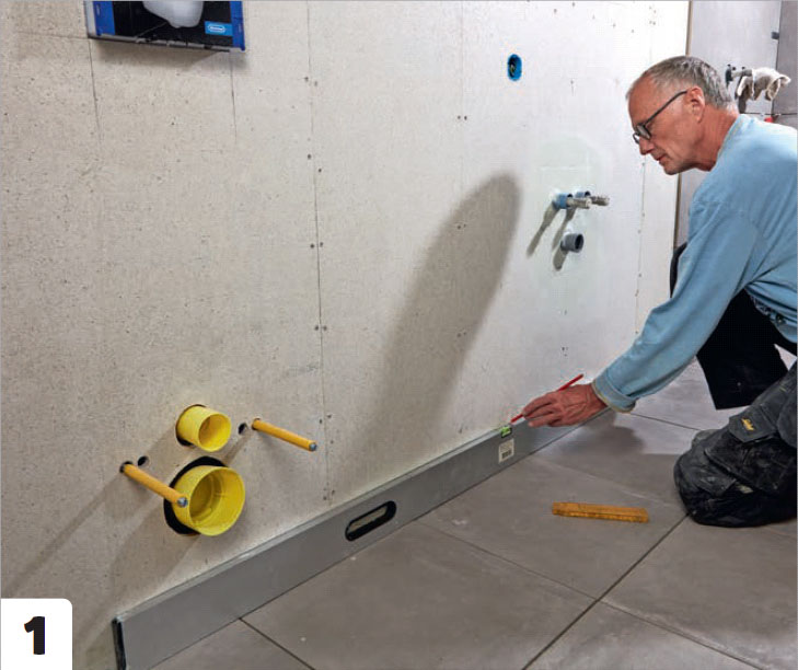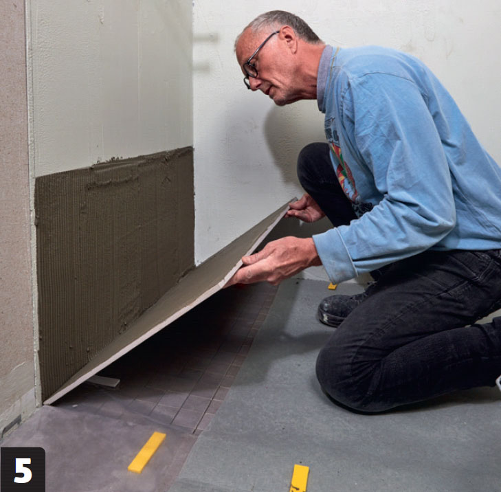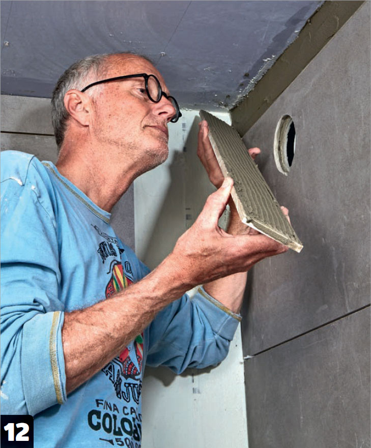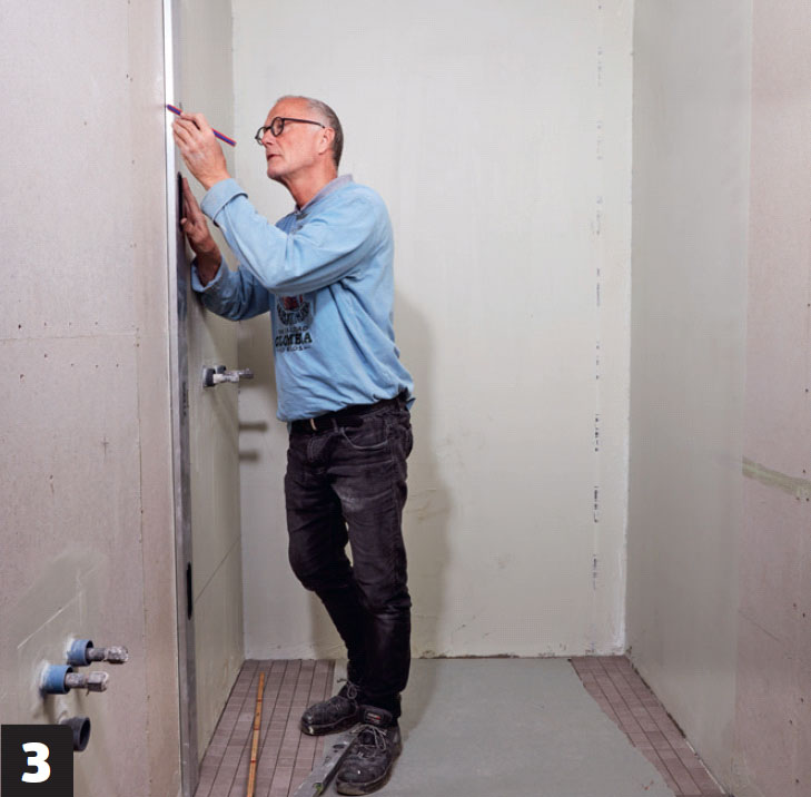 Nu til væggene: Opsætningen af fliser i bruseafdelingen starter med opstregning på væggen, hvor bruseglasset skal være. Det er også lige her, vådrumsmembranen dækker til.