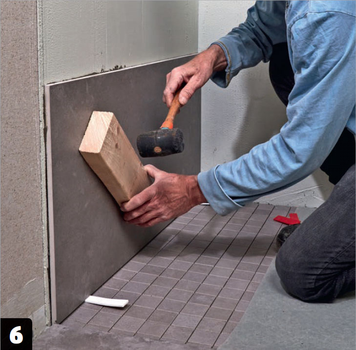 Flisen bankes forsigtigt på plads i klæberen med en træklods og en gummihammer. Flisen er så stor og tung, at det er vanskeligt at presse den på plads med hænderne.