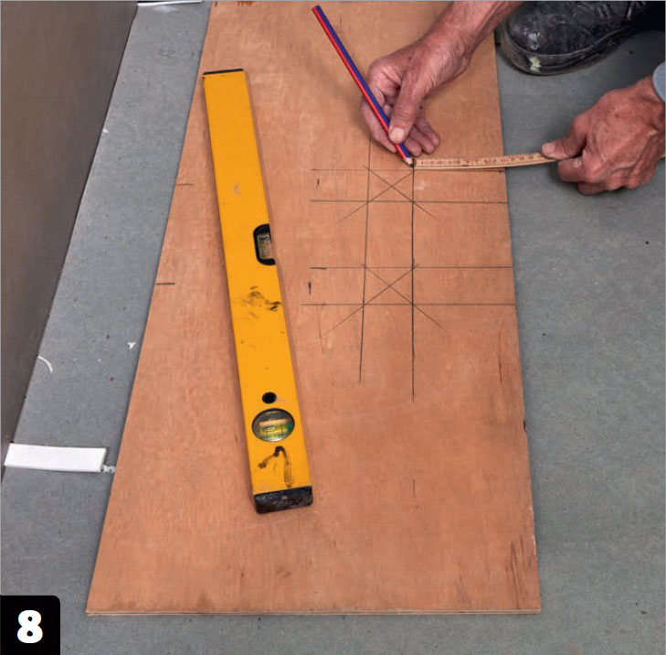 Vi overfører målene til en plade, der har samme mål som en flise. På den måde kan der laves en test og spares en kostbar flise, hvis vi måler forkert. Pladen er nu en skabelon, og hullerne tegnes over på flisen.