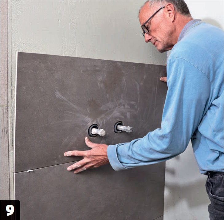Nu kan flisen sættes op. Hullerne, der blev tegnet op ved hjælp af skabelonen, er boret med et diamantkopbor.