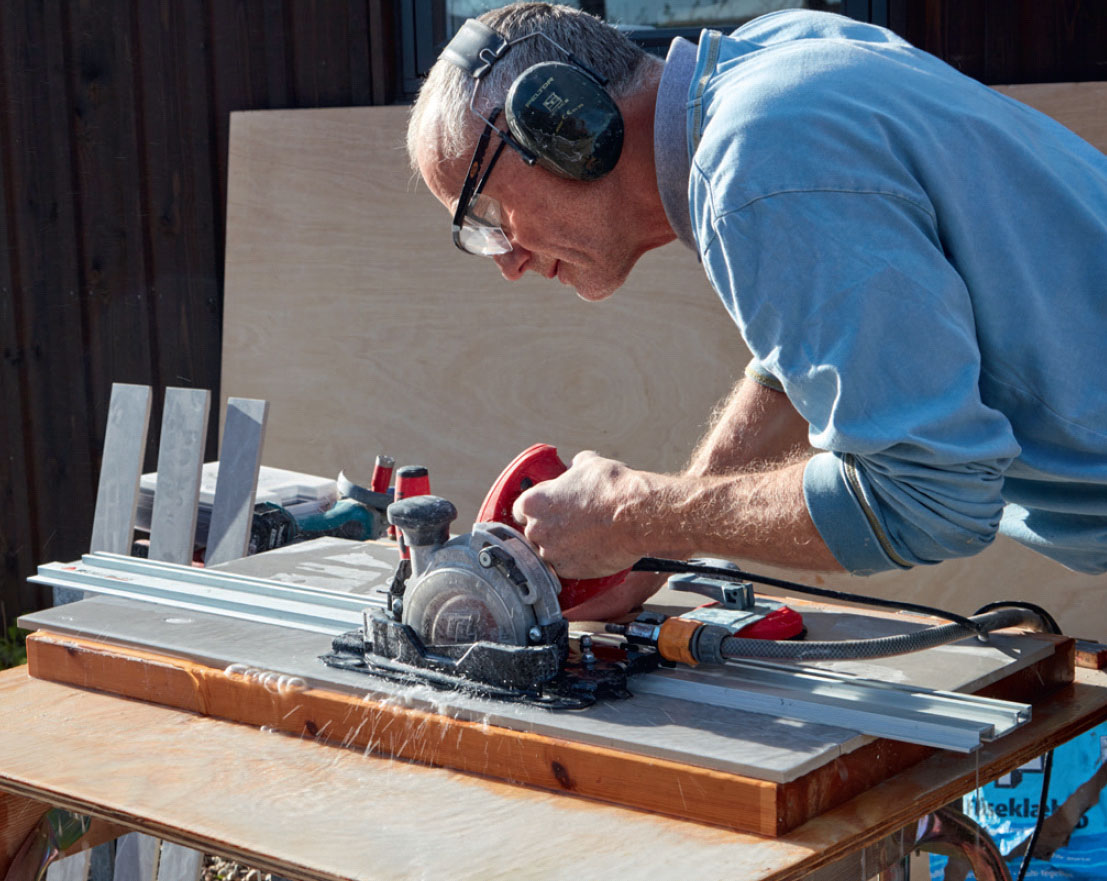 Hvis prøveoplægningen er præcis, kan fliserne allerede nu tilskæres til at passe omkring afløbet. Fliserne tilskæres bedst og mest præcist med en vådskærer med diamantklinge.