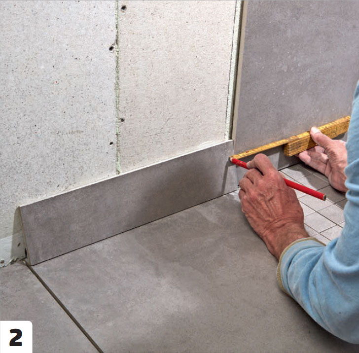 Streg op til flisesoklen. Langs badeværelsesgulvet skal der være en flisesokkel på min. 10 cm if. vådrumsreglementet. En lang retskinne hjælper med opstregningen.