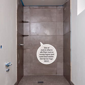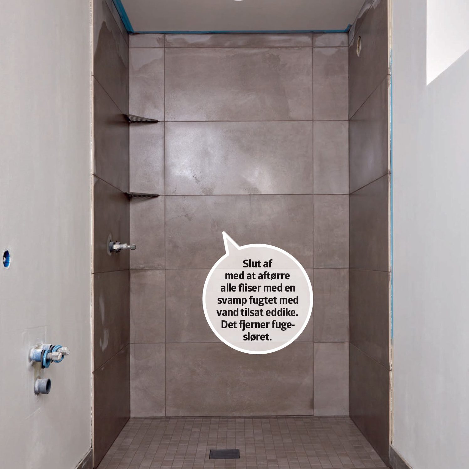 Husk at fjerne fugesløret til sidst med vand tilsat eddike (ca. en kop til en spand vand). Ellers får dine fuger et sløret udseende.