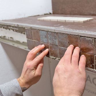 Fordel fliseklæber på vaskebordets overside, og læg flisen på plads. Tryk den godt fast, og brug evt. en gummihammer til finjustering. Tjek med vaterpasset, at flisen er vandret på begge ledder.