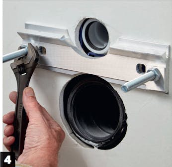 Dobbelttjek afstanden fra væg til beslag, og dobbelttjek, at det sidder i vater, inden du fortsætter. Senere skal toiletkummens skruer nemlig ramme skruehullerne i bøjlen.