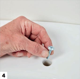 I hullerne til toiletbrættet droppes de medfølgende skruer - bare rolig, bøjlen sikrer, at de ikke falder længere. Skruerne ender i bøjlens skruehuller (se trin 10).